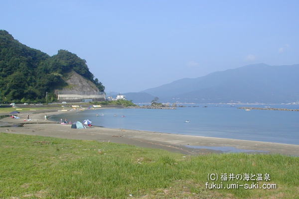 <江良海水浴場 詳細> 国道8号線沿い、道路から海が見えます。堤防付近でも大人の腰ぐらいの深さです。遠浅で水も綺麗な海です。五幡海水浴場もすぐ近くで歩いて5分程。
