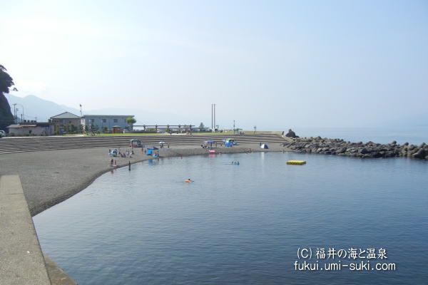 <甲楽城(カブラキ)海水浴場 詳細> しおかぜライン沿い、規模は小さめな砂利の浜です。駐車場の反対側に立ち寄り湯「シーサイドゆうばえ」があり、海水浴の後は、そちらに寄っていかれる方も多いようです。