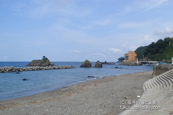<河野(コウノ)海水浴場 詳細> 敦賀方面より国道8号線から分岐した海沿いの道「しおかぜライン」を軽快に走り抜けると河野の集落があり、道路からは見えませんが、集落の向こうに浜があります。海に浮かぶ島があり景色は綺麗です。浜は少し大きめの石や小石の浜となっています。