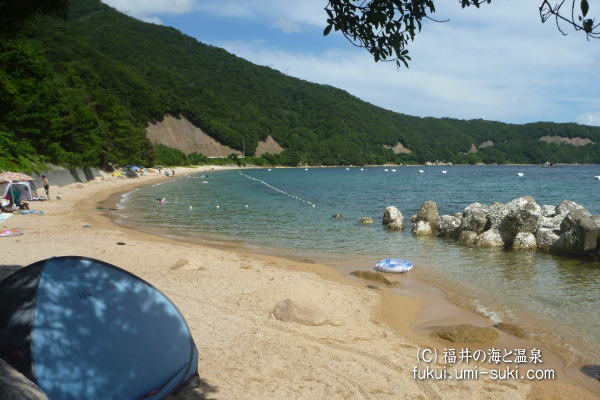 <手ノ浦(たのうら)海水浴場 詳細> 手ノ浦海水浴場が2ヶ所あります。1.5キロ下った所にも、もう1ヶ所あります。どちらも県道141号線沿いですので分かりやすいです。こちらは北側の海水浴場です。どちらも共に綺麗に管理されています。こちらは駐車場が海側です。 敦賀半島西岸の水晶浜などが人気ですが、こちらの浜もキレイで穴場です。