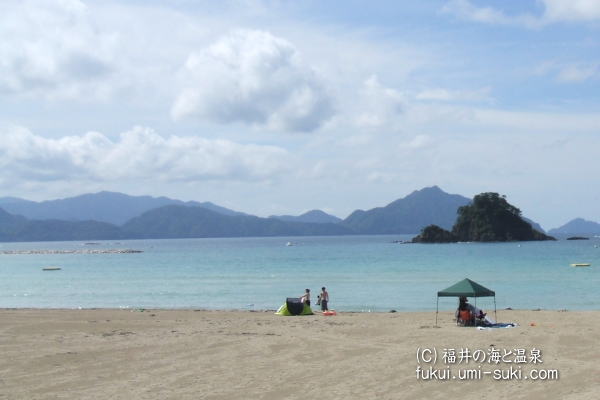 <若狭和田海水浴場 詳細> 関西方面からのアクセスが良く、福井県内外から多くの人が訪れるメジャーな海水浴場です。浜店も多く若狭和田は一大海水浴行楽地となっています。 西側の松林の中がキャンプ場になっており、キャンプも楽しめる。 和田浜から城山公園(城山海水浴場)にかけて約2.5キロにわたって浜が続いており、それぞれの浜で特徴があるようです。和田は若者が多く、白浜は波乗りなどマリンスポーツをする人が多く、鳥居浜、城山は家族連れが多いです。